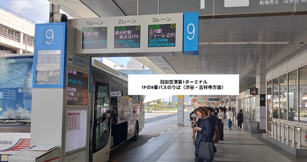 第1ターミナルから渋谷駅に向かうラインは「」番のりばです。羽田空港第1ターミナル 1階到着ロビー 9番のりば表示
