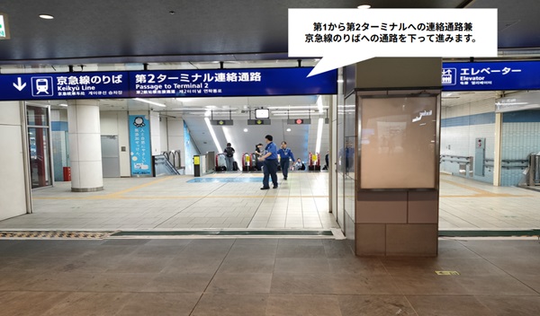 京急線の改札外にある第1ターミナルと第2ターミナルを結ぶ地下連絡通路を移動します。