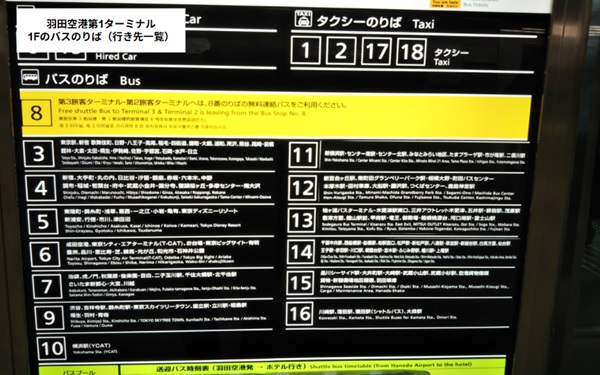 ちなみに以下の第3ターミナルにあるバスの行き先一覧には「0」番のりばの記載がありません。