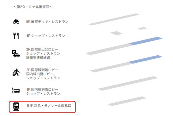 モノレールのりばの周辺には、京急線横に設置されているT1→T2間をつなぐ徒歩移動できる連絡通路が設置されているわけではありません。