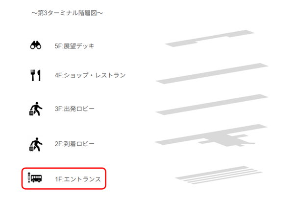 なぜか「0番のりば」がないのですが、第3ターミナルには、個人バスのりば、団体客用バス乗り場とターミナル間移動バス用のバス乗り場が3つ別場所に設置されています。