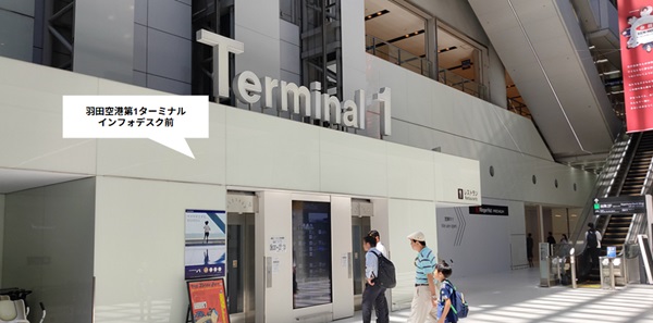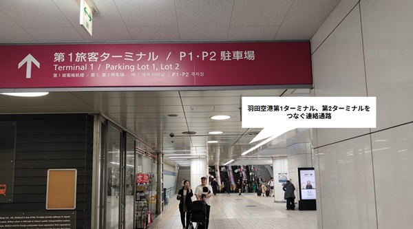 京急線の「羽田空港第1第2ターミナル駅」は第1ターミナルと第2ターミナルの中間あたりにホームが位置しています。改札横から出入りできる連絡通路を使って、第1と第2は徒歩で移動できます。